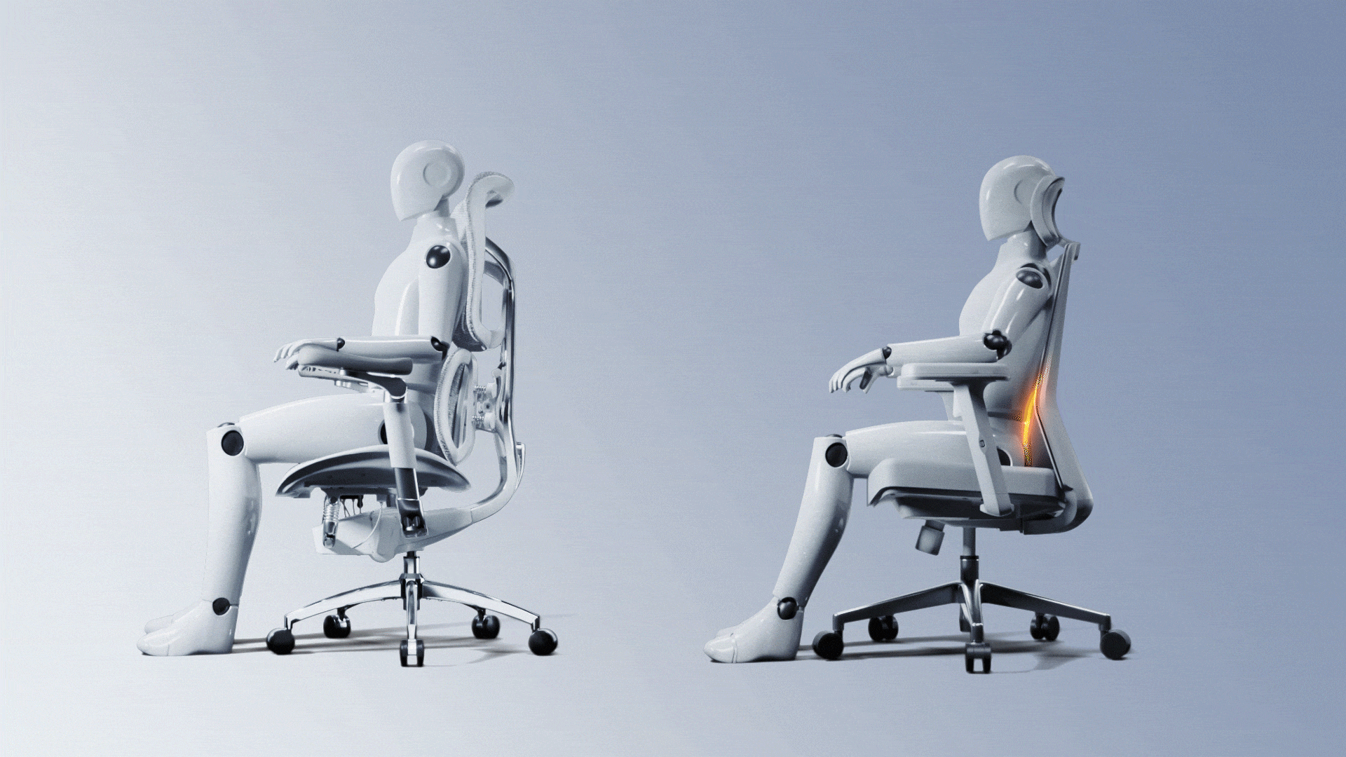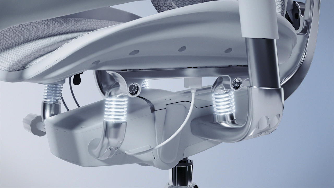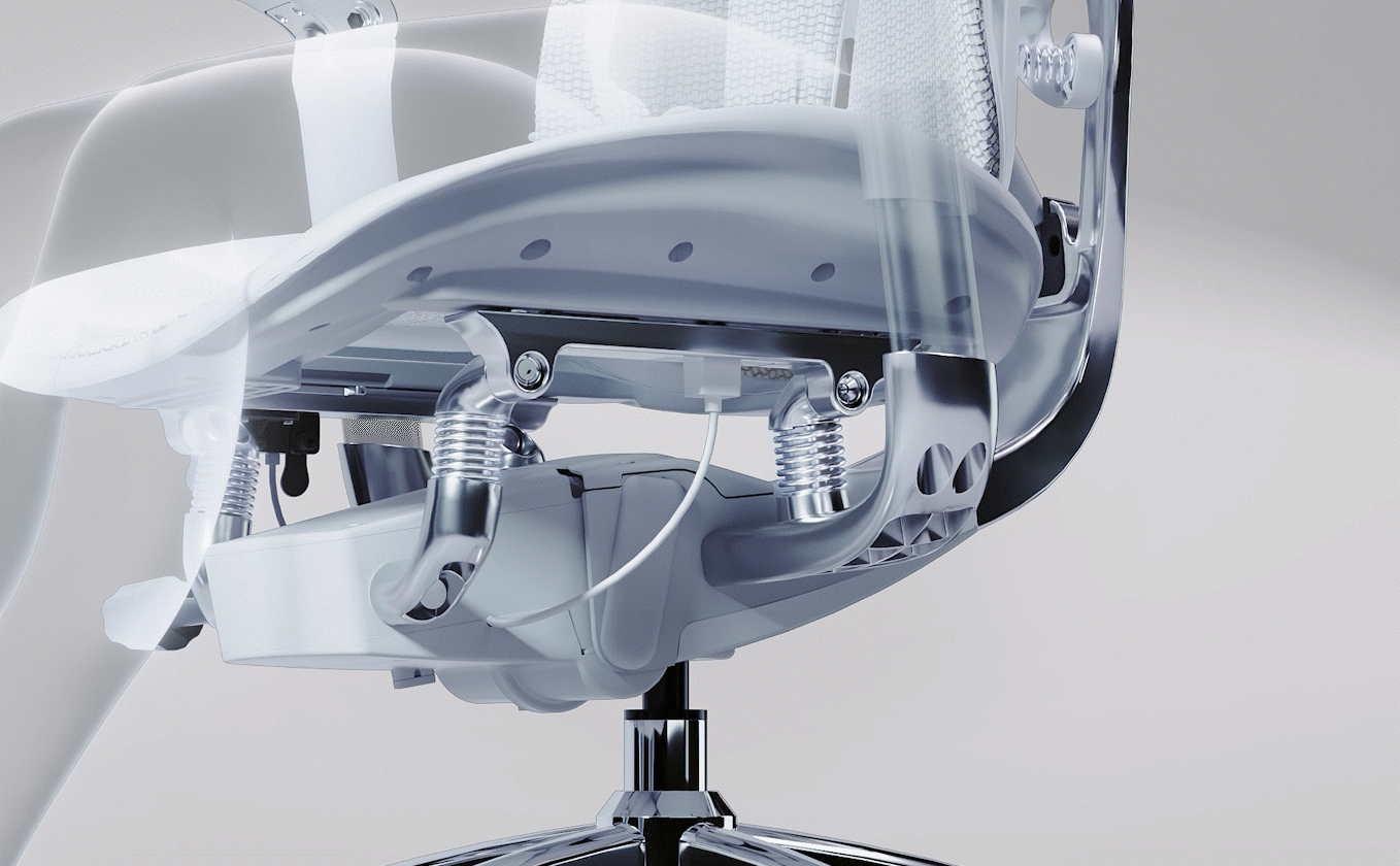 The standout feature of the chair is the single-piece, shiny metal main structure on the back, which connects the Anti-Gravity Mechanism, dual dynamic lumbar support, and independent backrest. Crafted from aluminum alloy using a 13-step process, it evokes the image of a goddess extending her arms in a welcoming embrace.