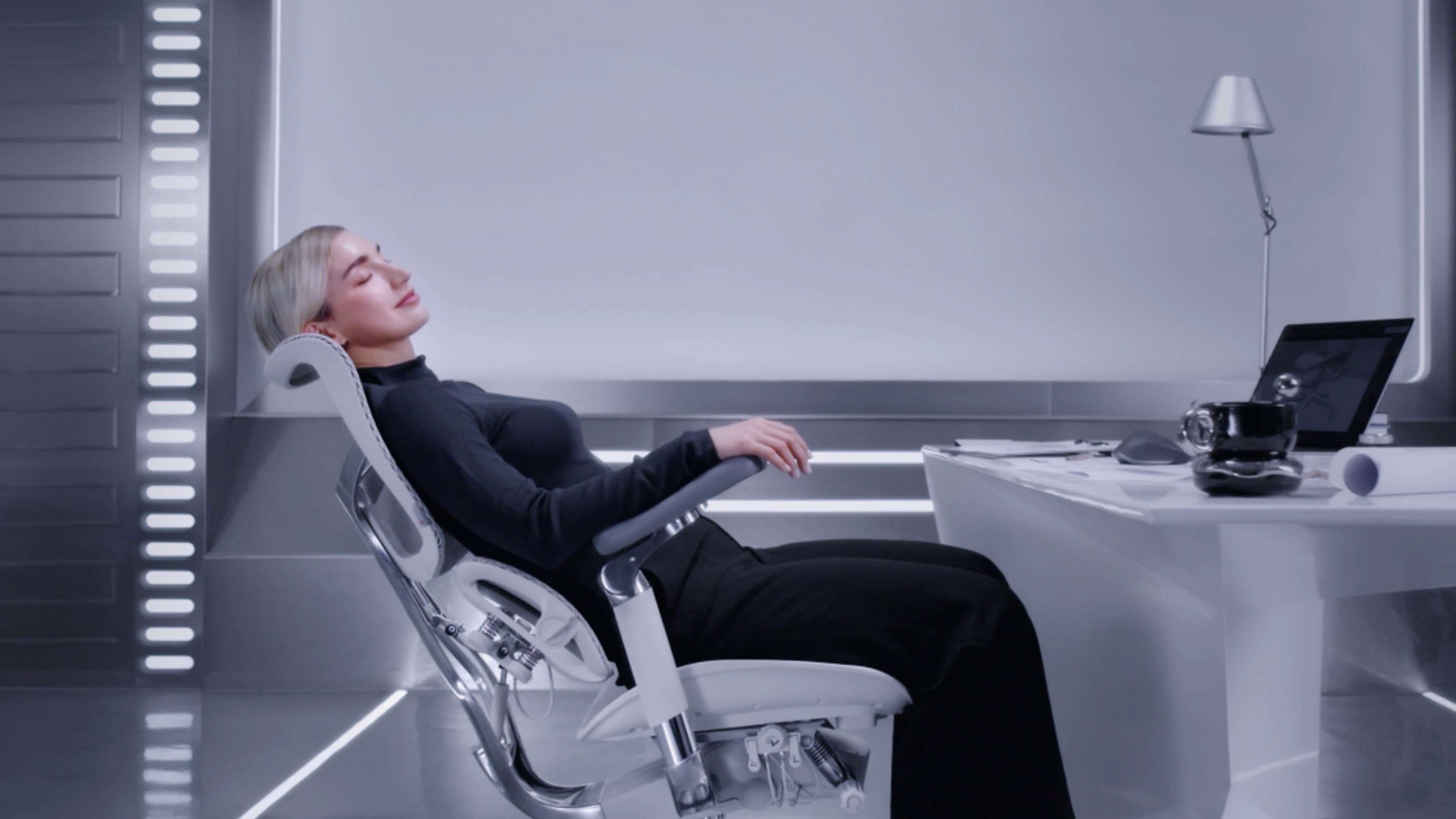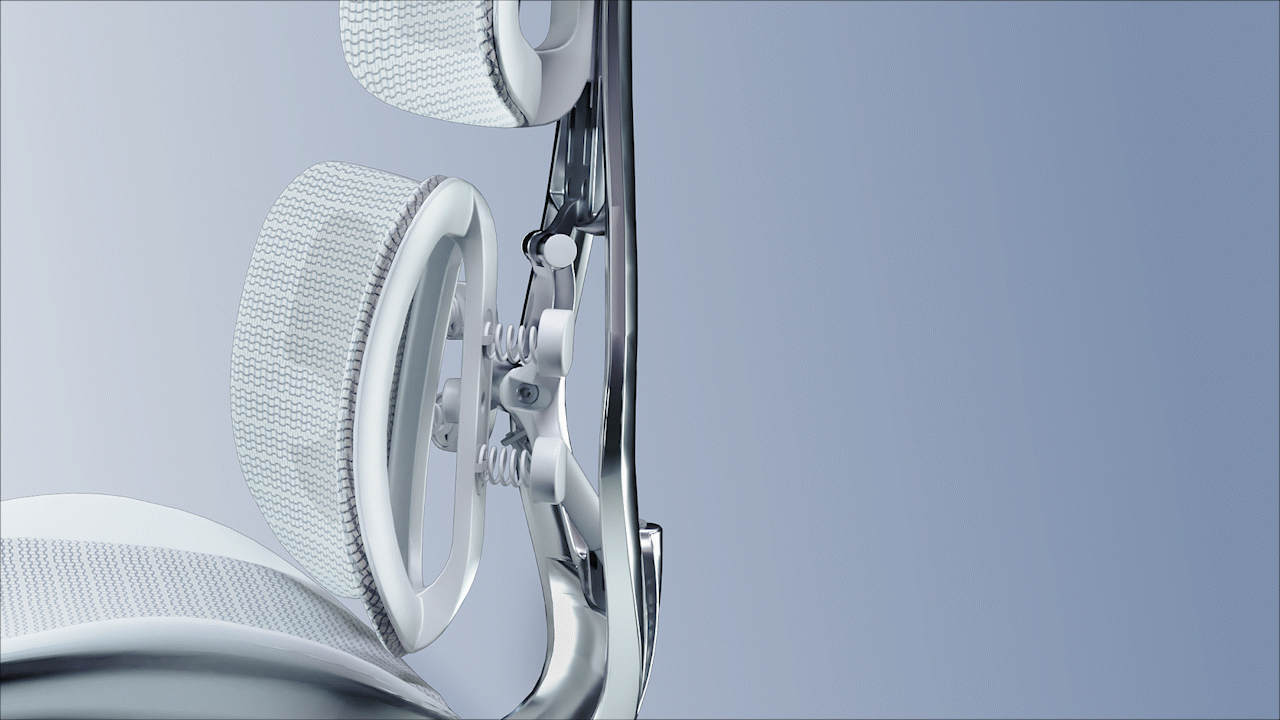 The standout feature of the chair is the single-piece, shiny metal main structure on the back, which connects the Anti-Gravity Mechanism, dual dynamic lumbar support, and independent backrest. Crafted from aluminum alloy using a 13-step process, it evokes the image of a goddess extending her arms in a welcoming embrace.