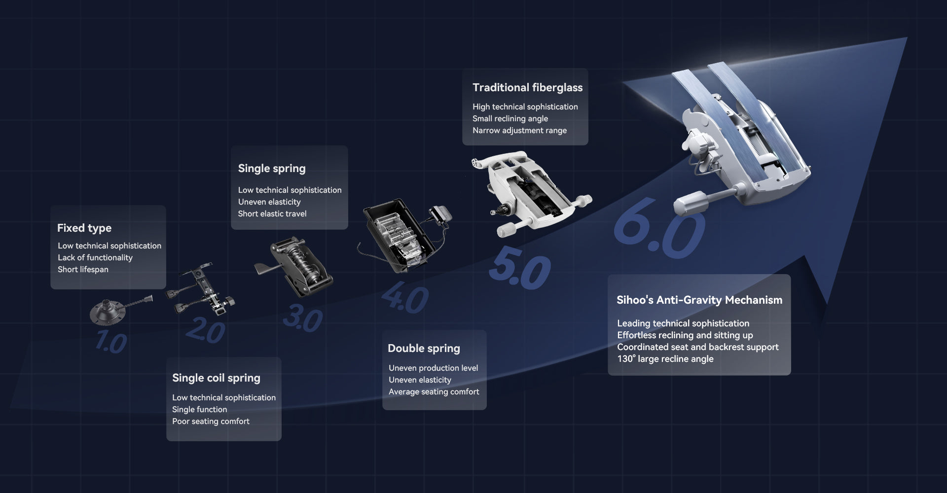 In 2019, as an industry leader, Sihoo embarked on the challenging journey of researching mechanism technology. After three years and the dedication of over 100 R&D engineers, we overcame the technical limitations of the traditional dual glass fiber spring mechanism in September 2022. This achievement redefined the reclining angle, marking a significant breakthrough in glass fiber mechanism technology. The result was the first generation of the Anti-Gravity Mechanism, now commercially available.